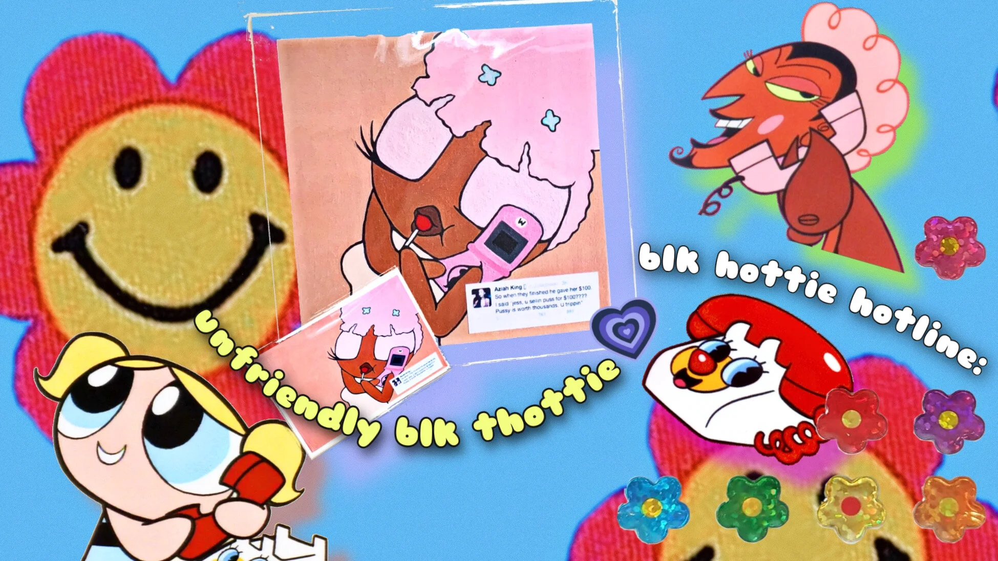welcome to a collection of art prints in celebration of blk girl multitudes. these prints are an ode to the animated representation I recieved in my girlhood years. the Blk Hottie Hotline was inspired by the many colorful cut-away phone scenes we got in 90s/y2k cartoons.